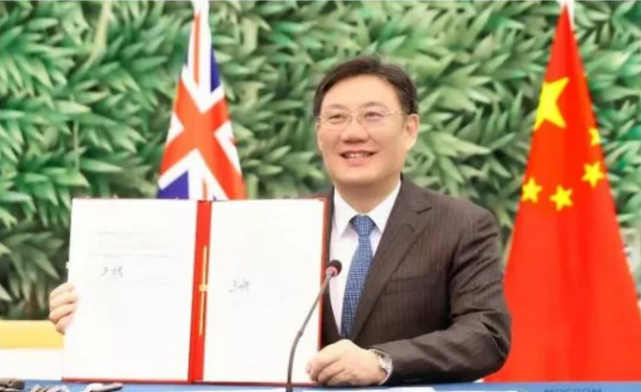 中國(guó)商務(wù)部部長(zhǎng)王文濤與新西蘭貿(mào)易和出口部長(zhǎng)Damien OConnor以視頻方式簽署中新自貿(mào)協(xié)定升級(jí)議定書。